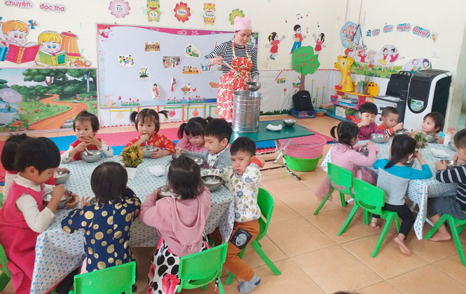Tìm hiểu về thực trạng này, chúng tôi đến Trường Mầm non Vinh Sơn (xã Vinh Sơn). Hầu hết các lớp học đều có từ 35-45 cháu/lớp, trong khi diện tích lớp học nhỏ hẹp, chưa đáp ứng nhu cầu dạy và học của giáo viên (GV) và học sinh. Bà Nghiêm Thị Thảo, Hiệu trưởng Nhà trường cho biết: Trường Mầm non Vinh Sơn hiện có 264 cháu, chia làm 8 lớp, ở các nhóm tuổi khác nhau. Trong đó, 3 lớp có số lượng trẻ trên 40 cháu. Với số học sinh khá đông, trong khi nhà trường chỉ có 13 GV, theo quy định của ngành Giáo dục về số GV/lớp (tùy theo từng nhóm tuổi), chúng tôi thiếu 4 GV. Điều này đã ảnh hưởng đến việc bố trí GV đứng lớp chăm sóc, dạy dỗ các cháu. Hiện, Nhà trường đang được Thành phố quan tâm, đầu tư xây dựng thêm nhà lớp học 2 tầng 8 phòng học, dự kiến năm học tới Nhà trường sẽ đón 300 cháu đến lớp. Nếu không tuyển được thêm GV, chúng tôi sẽ thiếu 6 GV.