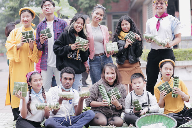 Sinh viên Khoa Quốc tế trải nghiệm làm bánh chưng Tết trước đợt nghỉ phòng chống dịch COVID-19.