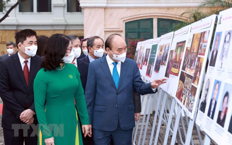 Chủ tịch nước Nguyễn Xuân Phúc xem trưng bày ảnh do Thông tấn xã Việt Nam và Học viện Nông nghiệp Việt Nam phối hợp tổ chức. (Ảnh: Thống Nhất/TTXVN)