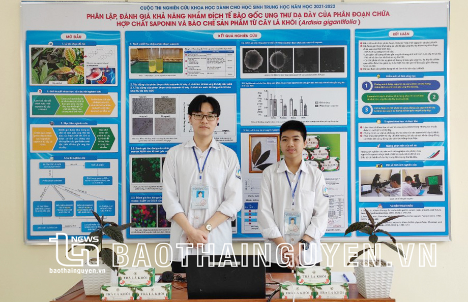 Dự án thứ hai là Phân lập, đánh giá khả năng nhắm đích tế bào gốc ung thư dạ dày của phân đoạn chứa hợp chất saponin và bào chế sản phẩm từ cây lá khôi (Ardisia gigantifolia), thuộc lĩnh vực Sinh học tế bào và phân tử. Dự án do HS Đào Xuân Minh, lớp Anh 11 và Nguyễn Lê Cường, lớp Sinh 11 nghiên cứu; cô giáo Trương Thị Thanh, Trường THPT Chuyên Thái Nguyên hướng dẫn.