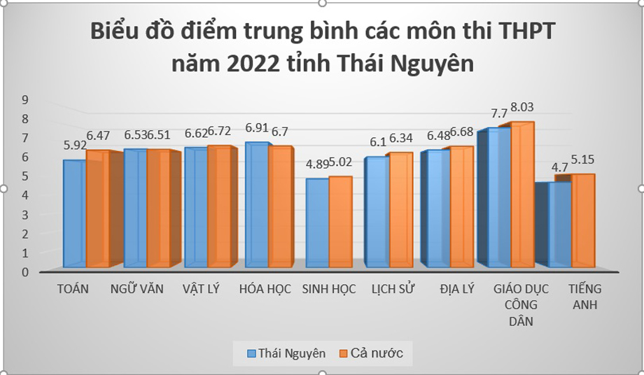 Với bình quân các môn thi 6,17 điểm, Thái Nguyên đứng thứ 41 toàn quốc về điểm trung bình các môn thi tốt nghiệp THPT năm 2022, tăng 2 bậc so với năm 2021 (nếu chỉ tính riêng hệ Giáo dục trung học Thái Nguyên đứng thứ 27 toàn quốc với điểm thi bình quân 6,32).