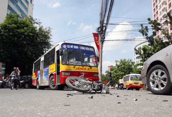 14h chiều nay, tại Hà Nội, một xe buýt lộ trình Bến xe Mỹ Đình - Công viên nước Hồ Tây đang chạy trên đường Láng Hạ vừa cán phải 1 xe máy khiến người điều khiển xe này bị thương.