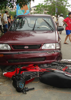 Sáng 14/4, tại ngã tư đường An Dương Vương, thành phố Vinh (Nghệ An), một ôtô mất lái, kéo lê xe máy chừng 10 m làm chủ phương tiện bị thương nặng.