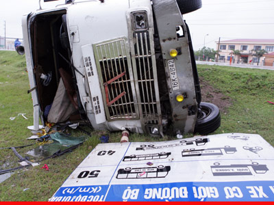 Có 2 người chui ra khỏi xe sau vụ tai nạn, lái xe chỉ bị thương nhẹ. Toàn bộ phần ca bin chiếc xe container sau vụ tai nạn đã bị bẹp, kính chắn gió vỡ nát. Thùng xe phía sau vẫn còn đầy hàng.
