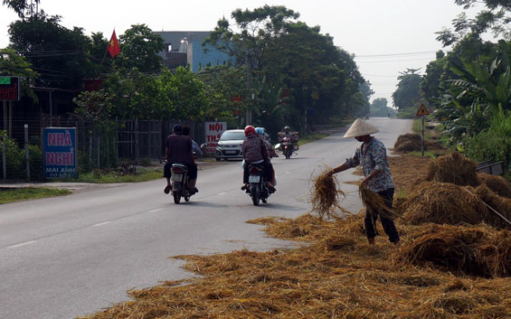 Những ngày này, các địa phương trên địa bàn huyện Phú Bình đang tập trung thu hoạch lúa mùa, rất nhiều tuyến quốc lộ, tỉnh lộ, đường liên xóm, liên xã bị bà con tận dụng để làm chỗ tuốt lúa, phơi, đốt rơm rạ. Đây là vấn đề đã tồn tại từ nhiều năm nay nhưng vẫn chưa được giải quyết triệt để.