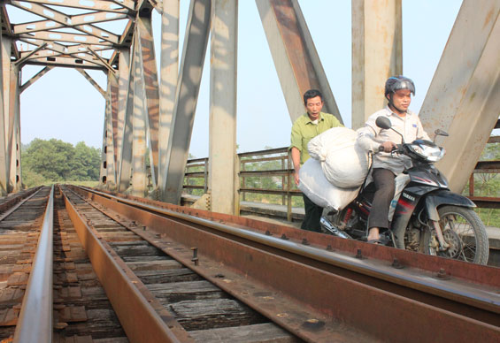 Chúng tôi đến cây cầu đường sắt nối với xóm Phúc Lẩm vào buổi chiều một ngày cuối tháng 12. Mặc dù chưa đến giờ tan tầm nhưng chúng tôi thấy khá nhiều người dân đi xe máy, xe đạp qua lại trên hành lang dành cho người đi bộ hai bên cầu. Hai hành lang này có lan can rộng khoảng 70cm nên những phương tiện chở hàng cồng kềnh không thể đi qua mà phải đi vào phần lề sát đường ray tàu. Chỉ gần một tiếng đứng tại cầu quan sát, chúng tôi đã thấy 5 chiếc xe máy chở bao tải đựng chè đi vào đường tàu. Mỗi chiếc xe đều có thêm một người giữ đằng sau để khỏi bị ngã. Chị Hoàng Thị Loan, ở tổ dân phố Cầu Thông 2, thị trấn Hùng Sơn (Đại Từ) cho biết: “Tôi là người nơi khác đến xóm Phúc Lẩm mua chè. Tôi biết đi vào phần lề sát đường ray tàu là rất nguy hiểm nhưng không có cách nào khác”. Còn chị Trần Thị Là, ở xóm Khuôn 5, xã Phúc Xuân, T.P Thái Nguyên cho biết: “Tôi phải thường xuyên vào xóm Phúc Lẩm mua chè, đi bộ còn thấy chóng mặt nên tôi thường xuyên phải nhờ người dân trong xóm lái giúp xe qua”. Theo phản ánh của người dân, ngoài xóm Phúc Lẩm, nhiều người dân ở các xã, thị trấn lân cận vẫn đi qua cầu đường sắt để sang Quốc lộ 37. Mật độ người đi lại trên cầu khá đông nên nhiều trường hợp đã bị đổ xe, ngã ở trên cầu. Ông Hoàng Thọ Nhân, người dân xóm Phúc Lẩm cho biết: “Tuần nào tôi cũng chứng kiến vài vụ xe đổ, ngã ở trên cầu nhưng may mắn chưa có tai nạn nghiêm trọng xảy ra. Nguyên nhân là do người dân đang đi thì tàu chạy qua, cầu rung mạnh, nhiều người tay lái yếu hoặc sợ hãi nên trượt ngã. Tự tay tôi cũng kéo vài trường hợp bị ngã, tụt xuống giữa các thanh chặn trên cầu”.
