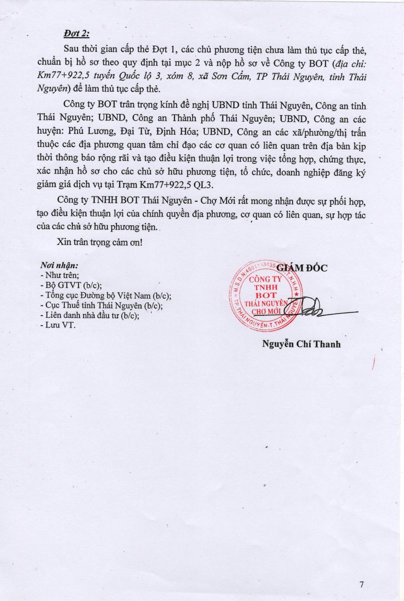 Để thực hiện việc giảm giá dịch vụ sử dụng đường bộ tại Trạm thu phí Km77+922,5 Quốc lộ 3 cho các phương tiện chính chủ của người dân có hộ khẩu thường trú, các tổ chức, doanh nghiệp có đăng ký kinh doanh và trụ sở chính đóng trên địa bàn thành phố Thái Nguyên, các huyện: Phú Lương, Đại Từ, Định Hóa thuộc tỉnh Thái Nguyên, Ngày 18/10/2019, Công ty TNHH BOT Thái Nguyên - Chợ Mới đã có thông báo số 333/CT-TB về việc giảm giá dịch vụ sử dụng đường bộ cho các phương tiện chính chủ có hộ khẩu thường trú, tổ chức, doanh nghiệp có đăng ký kinh doanh và trụ sở chính đóng trên địa bàn thành phố Thái Nguyên, các huyện: Phú Lưong, Đại Từ và Định Hóa thuộc tỉnh Thái Nguyên lưu thông qua Trạm thu phí Km77+922,5 - Quốc lộ 3. Dưới đây là nội dung Thông báo: