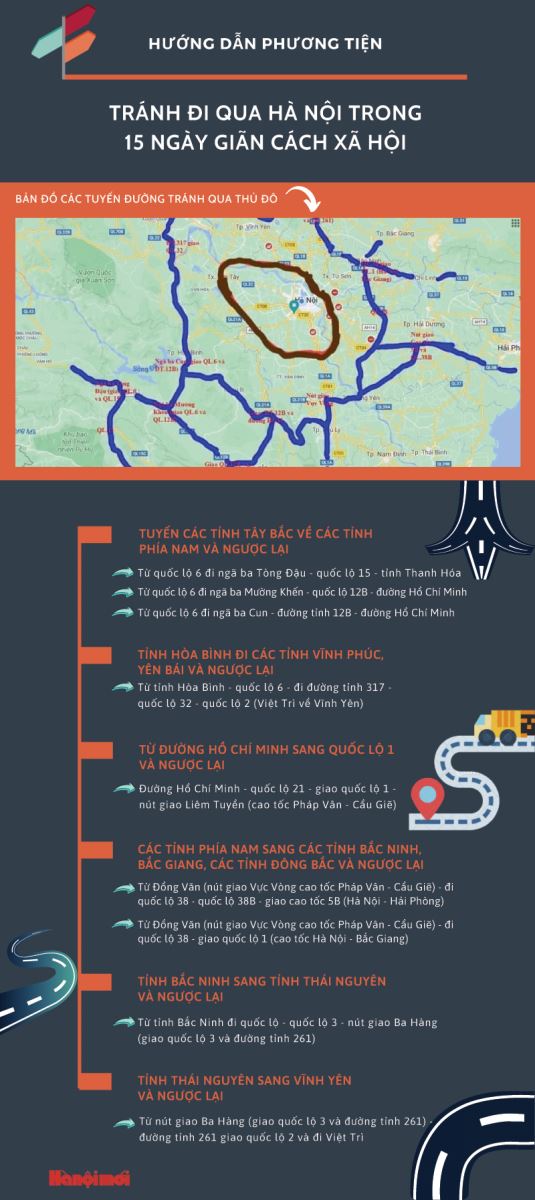 Thực hiện Chỉ thị số 17/CT-UBND của Chủ tịch UBND thành phố Hà Nội về thực hiện giãn cách xã hội trên địa bàn thành phố từ 6h ngày 24-7, Phòng Cảnh sát giao thông (Công an thành phố Hà Nội) có hướng dẫn phân luồng một số tuyến đường tránh đi qua thành phố Hà Nội cho các phương tiện.