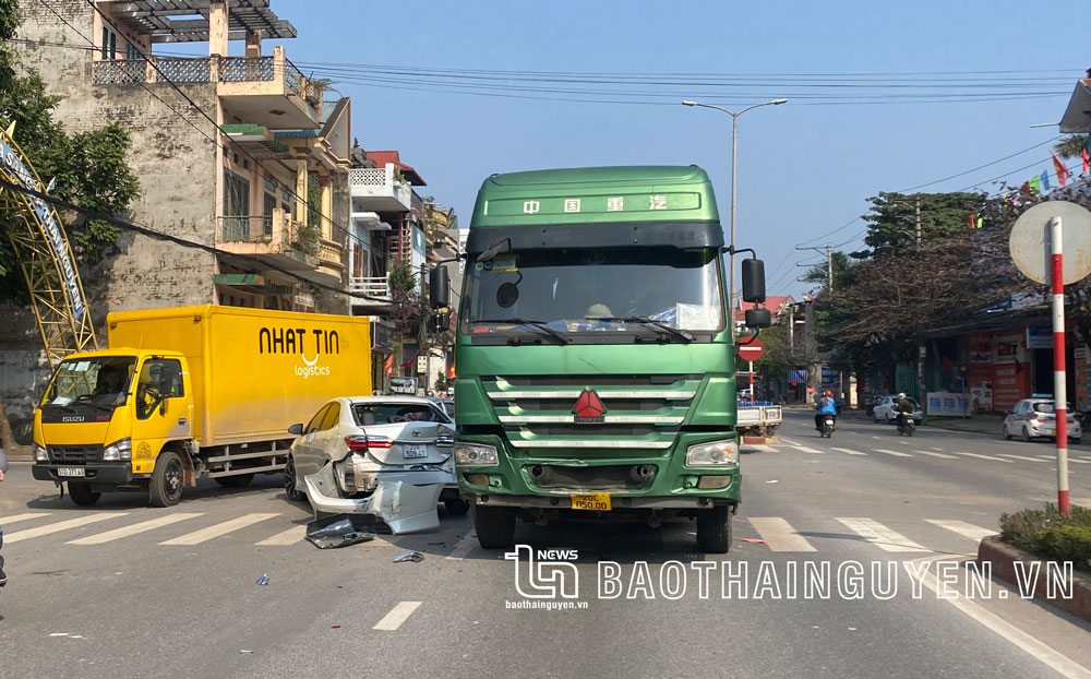 Sáng nay (25-2), một vụ tai nạn giao thông liên hoàn xảy ra trên đường cách mạng tháng 8, đoạn qua cổng khu dân cư số 9, phường Gia Sàng, thành phố Thái Nguyên, làm 4 xe ô tô bị hư hỏng, rất may không có thiệt hại về người.