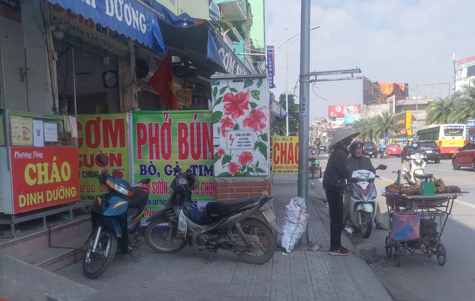 Nhiều nơi, hộ kinh doanh chiếm hết lối cho người đi bộ để bày bán, dự trữ hàng hóa. Ở khu vực gần bệnh viện, trường học, những người bán hàng rong thường đỗ xe trên vỉa hè hoặc ngay dưới lòng đường để bán hàng. Người đi đường cứ dừng xe lại mua, không dừng đỗ xe đúng nơi quy định, làm cho vỉa hè, lòng đường càng thêm chật hẹp.