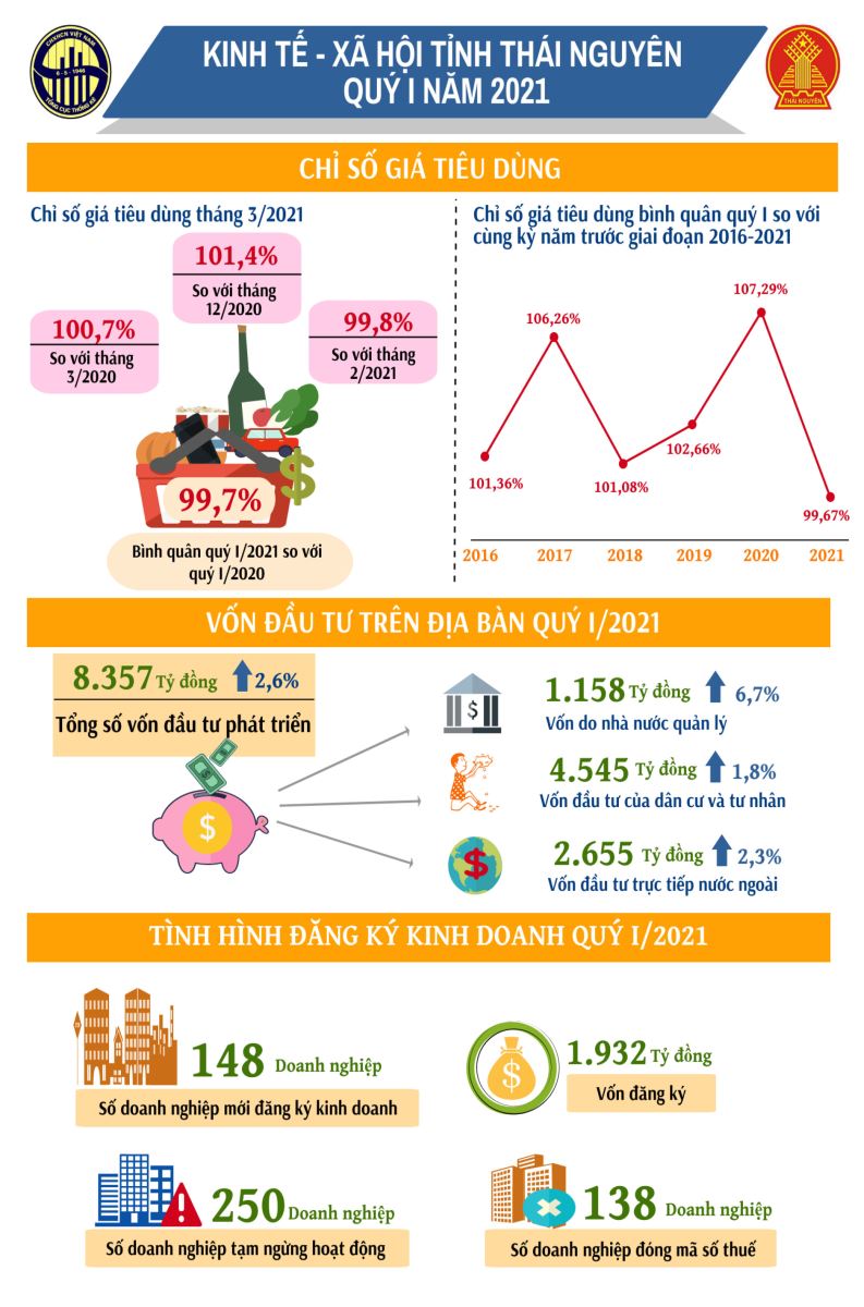 Để thực hiện thắng lợi nhiệm vụ Nghị quyết Đại hội Đại biểu Đảng bộ tỉnh Thái Nguyên lần thứ XX và Kế hoạch phát triển KT-XH 5 năm giai đoạn 2021-2025, ngay từ đầu năm, tỉnh đã khẩn trương tổ chức triển khai thực hiện các nhiệm vụ, giải pháp phát triển KT-XH. Đồng thời, triển khai nhiều biện pháp phòng, chống dịch COVID-19 để bảo đảm an toàn cho người lao động và duy trì sản xuất kinh doanh. Với sự nỗ lực, quyết tâm của các cấp, các ngành và nhân dân tỉnh Thái Nguyên, tình hình KT-XH trên địa bàn quý I/2021 đã đạt được những kết quả tích cực. An ninh, trật tự, an toàn được đảm bảo, các chính sách xã hội được quan tâm và thực hiện đầy đủ, đời sống của người dân ngày càng được nâng lên...