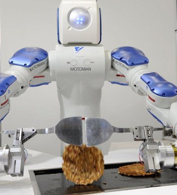 Với những động tác lật, rán rất khéo léo và chính xác, một robot đã chế biến thành công bánh kếp trong triển lãm đang diễn ra ở thành phố Osaka, Nhật Bản.