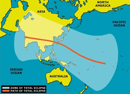 Sáng 22/7, đợt nhật thực toàn phần có thời gian dài nhất thế kỷ sẽ bắt đầu từ Ấn Độ, Nepal, Myanmar... rồi vượt ra ngoài Thái Bình Dương. Tại Việt Nam, nhật thực quan sát rõ nhất ở Hà Giang (75,8%), Hà Nội (67,5%) và TP HCM chỉ là 27,4%.