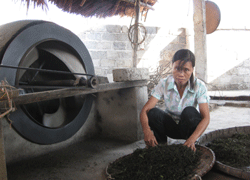 Hỏi chuyện bếp đun cải tiến, bà Phạm Thị Quyên, xóm Tân Thái đã vui vẻ nói: Bếp đun cải tiến ĐK tiết kiệm được nhiều củi đốt, nhưng với người dân xã Tức Tranh, nói chuyện tiết kiệm chất đốt phải kể tới việc sao sấy chè. Như gia đình tôi trung bình mỗi lứa làm được hơn 2 tạ chè khô, tương đương với 1 tấn búp tươi. Trước đây, với lò sao sấy cũ, để làm khô được số chè này, gia đình tôi cần khoảng 300 cân củi, từ tháng Tư năm nay, nhờ chế biến bằng lò cải tiến ĐK, số củi giảm còn khoảng 150 cân. Nói rồi, bà đưa chúng tôi ra xem chiếc lò sao chè cải tiến "hiệu ĐK" mới xây thêm trong tháng 10 vừa qua. Song lò cũng đã qua mấy lần lửa, nhưng màu vữa còn chưa… lên khói. Tôi nhẩm tính: Từ 2 chiếc lò đốt cải tiến ĐK này, với trung bình 8 lứa chè thu hái/năm, sản lượng 2,4 tấn khô, gia đình bà Quyên tiết kiệm được khoảng trên 1 tấn củi đốt. Còn như xóm Ngoài Tranh có 85 hộ, 100% số hộ của xóm sinh sống nhờ cây chè, hộ nhiều chè nhất như gia đình bà Cao Thị Lâm, mỗi lứa thu hoạch được hơn 3 tạ chè khô, còn các hộ khác thu đạt trung bình khoảng 150 kg chè khô/lứa. Cộng dồn cả xóm Ngoài Tranh lại, mỗi năm bà con làm ra khoảng gần 13 tấn chè khô. Nếu các hộ trong xóm đều có lò sao chè cải tiến như gia đình bà Lâm, ước nhẩm cũng tiết kiệm được khoảng 10 tấn củi đốt/năm.