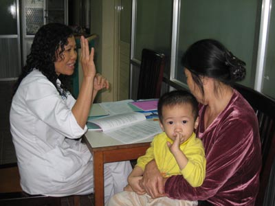 Bà đưa bé H. đi kiểm tra sức khỏe và được các bác sĩ Bệnh viện Nhi Trung ương hướng dẫn cách dạy bé. Ảnh: L.Hà