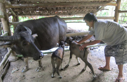Hiện hai con nghé đã được 7 ngày tuổi, phát triển bình thường, trọng lượng khoảng 30kg/con. Để trâu mẹ và nghé phát triển tốt, ngoài việc cho ăn cỏ gia đình ông Chung còn nấu thêm cháo cho trâu mẹ để đảm bảo sữa cho nghé bú.