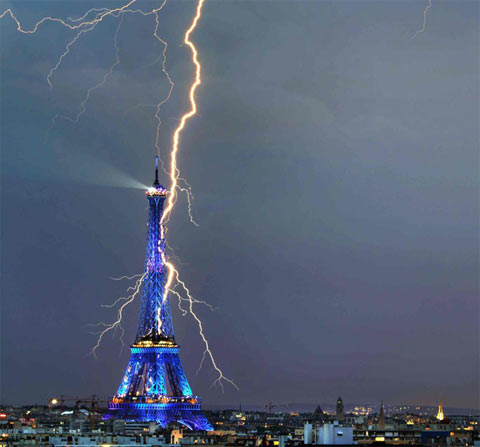 Tia sét giáng trúng tháp Eiffel tại thành phố Paris, Pháp.