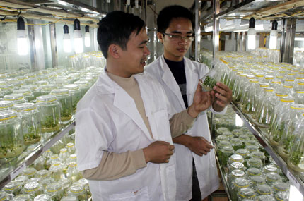 Chúng tôi được “đặc cách” vào trong Phòng cấy mô tế bào do Trung tâm phối hợp với Viện Khoa học sự sống - Đại học Nông lâm Thái Nguyên thực hiện (tất nhiên là phải tuân thủ quy định vệ sinh, khử khuẩn trước khi vào). Anh Nguyễn Văn Hồng, chuyên viên kỹ thuật Khu công nghệ tế bào thực vật thuộc bộ môn Công nghệ tế bào của Viện Khoa học sự sống giới thiệu: Đây là khu vực đặc biệt, chuyên nghiên cứu sản xuất các giống cây trồng bằng phương pháp nuôi cấy mô và thực hiện công nghệ nhà kính, nhà lưới. Chúng tôi đang nuôi cấy 17 giống cây trồng khác nhau, trong đó chủ yếu là cây ba kích tím, chuối tây, tiêu hồng, các chủng hoa lan cao cấp, các giống rau thuỷ canh... Khu vực này hiện đang được đánh giá là một trong những nơi đảm bảo nhất về duy trì và phát triển giống cây thông qua công nghệ cấy mô. Hiện tượng nhiễm khuẩn là khá phổ biến trong các phòng mô, tác động xấu đến sự sinh trưởng của cây trồng nhưng lại rất ít xảy ra đối với Trung tâm. Và nếu có xảy ra thì cũng được xử lý kịp thời bằng các phương pháp khử khuẩn hữu hiệu. Đây là điều mà không phải phòng cấy mô nào cũng làm được. Theo đánh giá chuyên môn thì việc nhân giống thông qua cấy mô tế bào có nhiều ưu việt hơn so với nhân giống bằng hom, gieo hạt, trồng củ. Công nghệ cấy mô sẽ giúp cây trồng đảm bảo tính di truyền tốt nhất, bộ rễ phát triển nhanh, khoẻ cho năng suất cao, có thể cung cấp số lượng lớn cùng một lúc, góp phần phục vụ tốt quy trình sản xuất hàng hoá… Trong những năm qua, Trung tâm đã rất thành công trong việc áp dụng công nghệ này và chuyển giao hiệu quả vào thực tế sản xuất của người dân trong khu vực.