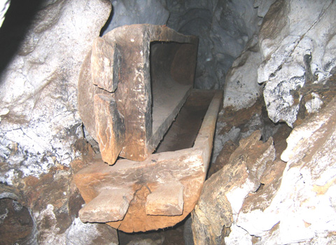 Hiện phần nắp trên của quan tài đã bị bật mở, tấm đáy của quan tài, nơi đặt thi thể người chết đã bị thủng lớn theo chiều dọc tấm gỗ, khiến cho xương người và cả đồ tùy táng rơi xuống nền hang.
