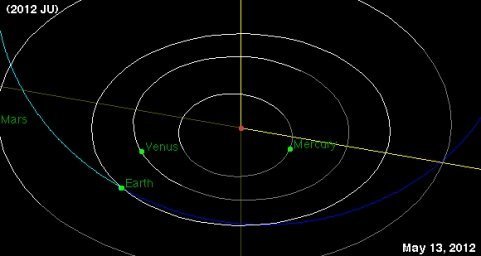 Các nhà khoa học thuộc Dự án theo dõi vật thể gần Trái đất của Cơ quan vũ trụ Mỹ (NASA) cho biết, ngày 13/5, thiên thạch 2012 JU, dài khoảng 12m, đã bay qua Trái đất ở khoảng cách 191.500 km – chỉ bằng một nửa khoảng cách 382.900 km giữa Mặt trăng và Trái đất.