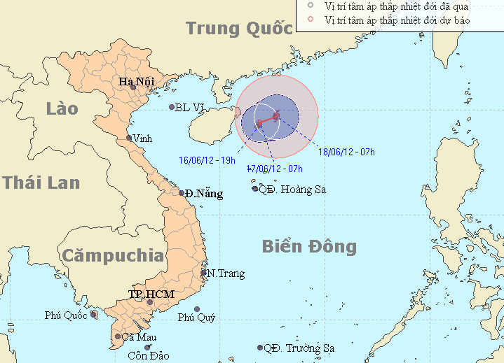Hồi 7 giờ ngày 17/6, vị trí tâm áp thấp nhiệt đới ở vào khoảng 19,4 độ vĩ Bắc; 111,9 độ Kinh Đông, cách đảo Hải Nam (Trung Quốc) khoảng 120km về phía Đông. Sức gió mạnh nhất vùng gần tâm áp thấp nhiệt đới mạnh cấp 6, cấp 7 (tức là từ 39 đến 61 km một giờ), giật cấp 8, cấp 9.