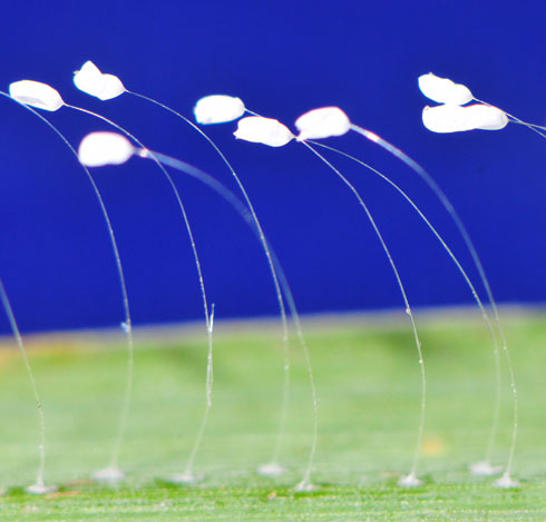 Chiều 7/6, chị Lê Nguyễn Quỳnh Anh ở khu phố Ninh Tịnh 2, phường 9, TP Tuy Hòa (Phú Yên) phát hiện trên lá cây sả trước nhà có một khóm hoa màu trắng li ti hình chuông, nhiều cánh, thân mảnh như tơ.