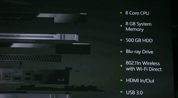 Không giống như Sony tỏ ra giữ kín cấu hình trong ngày ra mắt cấu hình PS4 vào đầu năm nay, Microsoft tự tin giới thiệu Xbox One sử dụng bộ vi xử lý AMD lên tới 8 nhân, 8GB RAM, 500GB ổ cứng, sử dụng giao tiếp USB 3.0, Wifi và đầu đọc đĩa Bluray. Không chỉ là chiếc máy chơi game cầm tay, Microsoft còn hướng đến Xbox One như một thiết bị giải trí tổng hợp với việc xem những bộ phim chuẩn HD, nghe nhạc hay lướt web.