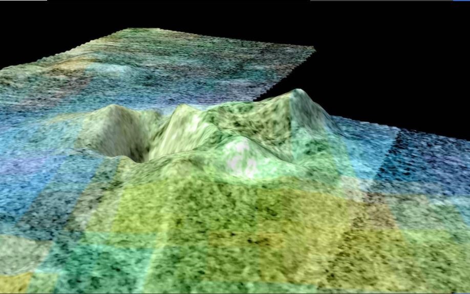 Các nhà khoa học xác định một hố va chạm Wright Mons của sao Diêm Vương. Các dấu hiệu quan sát được chỉ ra rằng Wright Mons đã hoạt động núi lửa muộn trong lịch sử của sao Diêm Vương. Dòng dung nham băng giá từ Wright Mons có thành phần của nước, amoniac và một thành phần màu được cho là chất hữu cơ phức tạp. Ảnh: NASA.