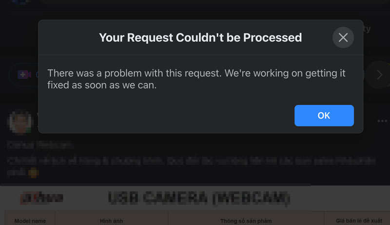 Lỗi lạ liên quan tới việc thông báo “Your request couldnt be Processed” (yêu cầu không thể xử lý) liên tục xuất hiện trên màn hình khiến nhiều người dùng Facebook tại Việt Nam gặp phiền toái.
