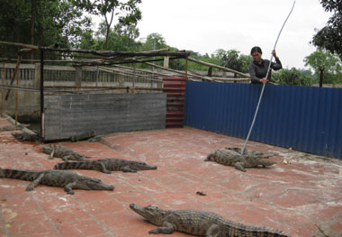 Theo chị ra thăm khu chăn nuôi cá sấu, điều khiến tôi bất ngờ là cả đàn cá hung hăng, phàm ăn, có thể quăng mình từ dưới ao nước lên bờ đớp người cũng trở lên hiền lành khi thấy bà chủ chia mồi. Chị Huệ cho biết: Mấy hôm trước trời mưa, lạnh, thấy lũ cá vùi mình trong nước, 1 nhân viên giúp việc đang đứng nói chuyện trên bờ đã bị cá nhảy lên cắn rách ống quần… Thật hú vía... Rất may, hôm chúng tôi đến thăm khu nuôi cá sấu của chị Huệ, gặp buổi trời quang, nắng ấm, lũ cá sấu theo nhau trườn khỏi ao nước lên bờ hong ánh mặt trời, miệng há hốc. Chúng tôi quan sát lũ cá qua khe hàng rào, thỉnh thoảng có con gầm gừ, quật đuôi uỳnh uỵch vào nền sân. Còn ở dưới ao, mấy con cá sấu vùi mình trong nước, chỉ hé đôi mắt ti hí và hếch cái mũi nhô lên khỏi mặt nước vẻ hiền từ. Nhưng theo kinh nghiệm của chị Huệ: Đó là lúc cá sấu đang rình mồi, rất hung dữ nên không thể đến cạnh chúng. Nhưng khi đã được cho ăn no, lũ cá, con nào cùng lành như cục gỗ.