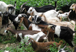 Từ xóm Hồng Cóc, qua vùng Nước Hai, Chín Suối lên trang trại dê mất nửa giờ chạy xe máy. Nhưng phải hôm trời mưa, đường lầy lội, đi bộ mất hơn 2 giờ mới tới nơi. Những hôm mưa, đàn dê không chịu rời chuồng đi tìm cỏ, cứ ngúc ngoắc cặp sừng vào gióng chuồng đợi chủ mang cỏ về cho ăn. Còn hôm nắng, lúc trời khô sương, vừa tháo gióng chuồng thì tiếng kêu be be đã vang khắp một vùng rừng núi. Ông Tám cho biết: Con dê lai mới được đưa về, nên chúng tôi đang cho chúng làm quen dần với điều kiện chăn thả tự nhiên. Song thỉnh thoảng cũng phải kiếm thêm cỏ hoặc cho ăn thêm khoáng chất để chúng có sức đề kháng. Hồi đầu năm nay, một dê mẹ sinh con, do thiếu sữa nên tôi phải ra chợ mua chai vú giả dành cho trẻ con và sữa bột về pha cho dê con bú.