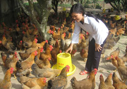 Công việc hàng ngày của anh chị ngày đi đến các thôn, xóm để vận đông nhân dân cùng tham gia các phong trào hoạt động của Hội của xóm như xây dựng Quỹ nhân đạo, Quỹ tình nghĩa, Quỹ chất độc da cam… Dù bận tối ngày nhưng anh chị vẫn dành thời gian để chăn nuôi lợn, gà, bò, tăng thêm thu nhập, ổn định kinh tế gia đình. Trên diện tích rộng gần 8.000 m2, anh chị quy hoạch dãy chuồng lợn gần nhà ở, trong chuồng luôn có 40 con lợn nái và lợn thịt. Trang trại nuôi gà gồm hai khu, khu vườn nhà rộng khoảng 4.000 m2, dành để nuôi 500 con gà đẻ trứng. Khu trang trại vườn đồi rộng 3.700 m2 dùng để nuôi 5.00 con gà thịt. Sau khi trừ các chi phí thì lãi từ chăn nuôi gà khoảng 40 triệu đồng và lãi do chăn nuôi lợn là 15 triệu đồng. Ngoài ra Anh chị còn cấy 8 sào ruộng và hơn 1 mẫu rau, màu.