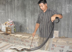 Dẫn chúng tôi đi tham quan một vòng quanh trang trại, anh kể: Năm 2002, tôi lập gia đình. Tài sản của 2 vợ chồng lúc đó chẳng có gì đáng giá ngoài vài sào ruộng, cấy lúa cũng chỉ đủ ăn. Tôi có làm thêm nghề sửa chữa đồ điện gia dụng, lắp đặt điện nước nhưng công việc lúc có, lúc không. Một lần tình cờ sang chơi nhà người bạn ở Vĩnh Phúc, thấy có mô hình chăn nuôi rắn Hổ mang đem lại hiệu quả kinh tế cao, tôi đã học hỏi và tìm hiểu thêm thông tin trên mạng Internet. Năm 2003, tôi bắt đầu nuôi khoảng mười con rắn. Vừa nuôi tôi vừa đi các tỉnh như Bắc Giang, Quảng Ninh để học thêm kinh nghiệm nuôi và ấp nở rắn con. Đến năm 2005, tôi được Chi cục Kiểm lâm tỉnh cấp Giấy phép chăn nuôi động vật hoang dã. Lúc này gia đình đã có 40 chuồng rắn Hổ mang. Anh nói: Nuôi rắn không phải mất nhiều công chăm sóc và đầu tư thức ăn như chăn nuôi lợn. Nguồn thức ăn cho rắn cũng rất dễ kiếm, chủ yếu là cóc, nhái, gà con, vịt con, trứng ung... Trung bình cứ 3 ngày chúng mới ăn một bữa. Vào mùa lạnh, rắn ngủ đông 6 tháng. Hơn nữa, nuôi rắn không phải lo thị trường tiêu thụ vì cứ có sản phẩm ra là có người đến thu mua, giá bán lại cao.