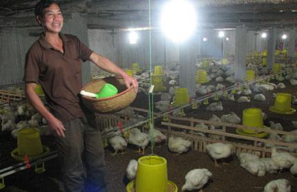 Tới thăm trang trại gà của gia đình anh Lưu Văn Bằng, hội viên Chi hội CCB xóm Đồng Se, chúng tôi thật khó tin rằng trước đây gia đình anh lại là một hộ nghèo. Trước mắt chúng tôi là diện tích đất rộng trên 5.000m2 đã được xây tường bao kiên cố, phía trong là khu chuồng trại 2 tầng chăn nuôi gà với quy mô khoảng 5 nghìn con/lứa. Anh Bằng tâm sự: Gia đình tôi có 4 nhân khẩu, chỉ có 3 sào ruộng, trước mỗi năm cấy 2 vụ lúa, thu nhập chẳng đủ trang trải cuộc sống và cho con ăn học. Đến năm 2007, được Chi hội CCB cho vay 5 triệu đồng, tôi đã mua công nông để chở hàng thuê, có thêm nghề phụ cuộc sống đã đỡ chật vật hơn. Sau 1 năm, gia đình tôi đã thoát nghèo và dành dụm được lưng vốn đầu tư chăn gà. Mới chăn, mỗi lứa tôi chỉ nuôi khoảng gần 100 con, rồi dần dần vốn nở ra đến đâu tôi đầu tư mở rộng quy mô đến đấy. Năm 2011, tôi đã xây dựng được chuồng trại kiên cố, đảm bảo mỗi năm chăn 4 lứa, mỗi lứa 4.000 con.
