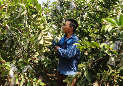 Rời nhà chị Ngoan, chúng tôi đến thăm “vua ổi” Nguyễn Văn Tuấn, ở xóm Khánh Hòa. Giữa màu xanh bạt ngàn của ổi, cái nóng gay gắt của ngày hè dường như dịu hẳn đi. Dẫn chúng tôi đi tham quan vườn, anh Tuấn cho biết: 5 năm trước, gia đình tôi trồng toàn các loại rau xanh ở khu vườn này nhưng sau nhiều năm rơi vào cảnh rau mất giá dẫn đến thu nhập không ổn định thì tôi bắt đầu nghĩ đến việc chuyển đổi sang loại cây trồng khác có hiệu quả kinh tế hơn. Sau khi thấy một số hộ trong xã “phất” lên nhờ cây ổi, tôi đã bàn với gia đình bỏ toàn bộ cây rau đi và mua 250 gốc ổi Đài Loan, ổi đào về trồng trên diện tích hơn 7.000m2 đất. Đến nay, mỗi vụ ổi chín, gia đình tôi cung cấp cho thị trường trong tỉnh khoảng 20 tấn quả và được thu lãi gần 200 triệu đồng/năm, cao gấp 3 đến 4 lần so với trồng rau.
