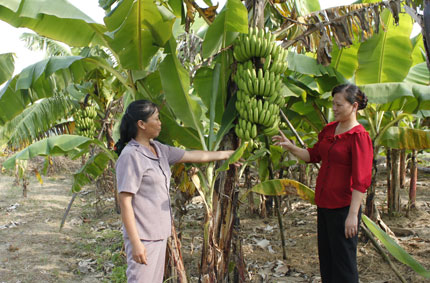 Các chị cho biết thêm: khi chọn giống, nên chọn cây non, thân to, khoẻ, không bị sâu bệnh, cao khoảng 70cm, cắt rễ và bỏ bớt 2/3 lá. Trước khi trồng nên tiến hành xử lý bộ rễ bằng cách lăn gốc chuối vào tro hoặc nhúng qua hỗn hợp lân. Không nên đặt cây quá sâu, trồng đến đâu dùng chân giậm nhẹ, tưới nước đến đó để cố định cây, chú ý cho cây đứng thẳng. Để đảm bảo năng suất, cần bón phân kali hoặc phân chuồng vào lúc mới trồng và lúc cây trổ hoa, cần chú ý cắt tỉa các lá già, khi hoa chuối đã ra đủ nải thì nên cắt bỏ phần hoa thừa, tìm cây chống để phòng khi mưa gió làm cây bị đổ.