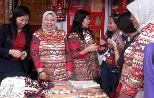 Sự khiêm tốn của người phụ nữ đất nước Đạo hồi khiến mọi người có mặt càng trở nên trân trọng. Bởi trong quầy trưng bày độc những loại vải đắt tiền, loại vải hiện giờ phần nhiều người dành cho Hoàng gia, người giàu có củaIndonesia mua dùng. Đến thăm gian trưng bày của nghệ nhân dệt Malaysia, giản dị hơn nhưng đó cũng là những thước vải đẹp nền nã, những chiếc khăn quàng cổ, khăn đội đầu mềm mại được nhiều du khách ướm thử để chụp ảnh làm kỷ niệm. Chủ gian trưng bày, ông Benedictus Bangmtuan bảo: Chúng tôi mang thổ cẩm của đất nước mình đến Hội thảo, với mục đích giới thiệu với bạn bè Việt Namvà quốc tế về nền văn hoá mặc người Malaysia. Cạnh đó, bà Somphone, nghệ nhân dệt đến từ đất nước Triệu Voi, là người Lào, song bà nói tiếng Việt Namrành rẽ: Tôi thay mặt các nghệ nhân nghề dệt của đất nước Lào mang vải thổ cẩm đến Việt Nam trưng bày tại Hội thảo, không mong chuyện hơn thua, mà để giới thiệu với các bạn quốc tế về nghề dệt truyền thống của đất nước tôi. Còn nghệ nhân nghề dệt Cam pu chia, bà Moeun Sophean khiêm tốn: Tôi đi thăm gian trưng bày của các bạn Việt Nam, vải thổ cẩm của các bạn rất đẹp. Nghệ nhân nghề dệt của các nước đều rất tự hào về sản phẩm truyền thống, vải thổ cẩm của mỗi dân tộc, mỗi quốc gia trên thế giới lại có nét độc đáo riêng, phản ánh sắc nét về văn hoá, tập quán của dân tộc. Tiến sĩ Siti Norkhalbil, Trưởng đoàn Brunei cho biết: Dệt may truyền thống đại diện tượng trưng cho di sản và bản sắc dân tộc Brunei, hiện đang trong nhiều công sở của Nhà nước được sử dụng hàng dệt truyền thống làm trang phục công sở, việc này không chỉ là biện pháp để thúc đẩy và mở rộng thị trường, mà trực tiếp bảo đảm giữ gìn được di sản văn hoá Brunei.