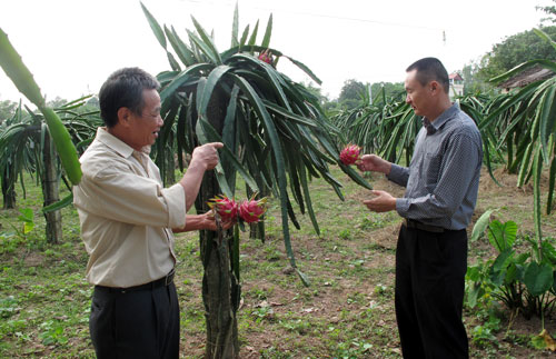 Cùng chị Ngô Thị Mai Hương, cán bộ Trạm Khuyến nông đến thăm mô hình trồng Thanh Long ruột đỏ của gia đình bác Dương Đình Bộ, xóm Pha, xã Lương Sơn chúng tôi không khỏi ngỡ ngàng trước khu vườn được trồng rất quy cách. Dẫn chúng tôi đi thăm vườn Thanh Long đang tỏa đầy cành, nhánh tràn đầy sức sống, bác Bộ nói: “Tôi là lính, rời quân ngũ về gia đình chỉ biết cuốc đất, lật cỏ tìm loại cây trồng tốt để nâng cao thu nhập cho gia đình. Gia đình tôi cũng đã trồng nhiều cây ăn quả như vải, nhãn, hồng, giờ cây Thanh Long, tôi thấy tâm đắc nhất. Ngoài giá trị kinh tế cao, đây là loại cây rất ít nhiễm sâu bệnh, gần như không phải sử dụng đến thuốc bảo vệ thực vật nên đảm bảo an toàn về sức khỏe cả người trồng đến người sử dụng. Trung bình một năm, cây Thanh Long cho thu hoạch 12 lứa. Hạch toán kinh tế giữa cây Thanh Long và cây vải thiều được 5 năm tuổi cho thấy có sự khác biệt lớn. Thanh Long sau 3 năm trồng bắt đầu cho thu hoạch trái, đến năm thứ 5 cho năng suất tương đối ổn định, thu lãi khoảng 408 triệu đồng/ha, cây vải thiều đến năm thứ 5 cũng cho thu lãi chỉ khoảng 266 triệu/ha. Ngoài ra, Thanh Long có thời gian thu quả dài, nhiều lứa trong năm nên tránh được tình trạng trượt giá, việc tiêu thụ dễ dàng hơn rất nhiều so với vải. Được biết từ quy mô ban đầu 180 hốc, bác Bộ đã mở rộng quy mô lên 500 gốc. Năm nay, đã có 250 gốc cho quả với sản lượng trên 2 tấn, với giá bán bình quân tại vườn 40 nghìn đồng/kg, bác thu về trên 80 triệu đồng, cộng với tiền bán giống cây, cho thu nhập trên 100 triệu đồng/năm, trừ chi phí như phân bón, công lao động, bác tiết kiệm được khoảng 80 triệu đồng.