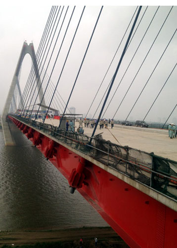 Sáng nay (15/4), Ban quản lý Dự án 85, Bộ Giao thông Vận tải tổ chức lễ hợp long cầu Nhật Tân qua sông Hồng. Bộ trưởng Bộ Giao thông Vận tải Đinh La Thăng và ông Fukuda Hiroshi, Đại sứ Nhật Bản tại Việt Nam cùng dự lễ.