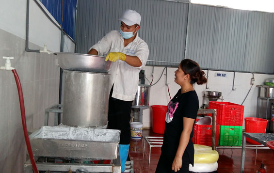 Anh Nguyễn Hồng Quân, công nhân sản xuất chính tại Công ty TNHH Sản xuất Thương mại Minh Tâm cho biết: Chúng tôi làm ở đây đều được chị Hà cho đi học nghề làm bún, đậu phụ, được tham gia các lớp học nghiệp vụ đảm bảo an toàn vệ sinh thực phẩm. Chị Hà yêu cầu rất khắt khe về kỹ thuật sản xuất đảm bảo an toàn, làm việc phải mặc bảo hộ lao động, đeo găng tay, khẩu trang đầy đủ. Khu vực sản xuất phải luôn luôn được vệ sinh sạch sẽ.