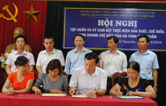Đồng chí Ngô Xuân Hải, Giám đốc Sở Nông nghiệp và PTNT (người đứng giữa) chứng kiến Lễ ký cam kết sản xuất, chế biến kinh doanh chè bảo đảm an toàn thực phẩm giữa Chi cục Quản lý chất lượng nông, lâm, thủy sản tỉnh và các hộ dân.