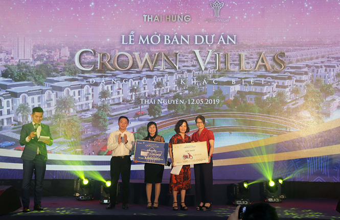 Ngày 12/5/2019, Công ty CPTM Thái Hưng đã tổ chức lễ mở bán Khu đô thị Crown Villas với sự tham gia của hơn 500 khách hàng quan tâm dự án. Trong ảnh: Lãnh đạo Công ty Thái Hưng trao thưởng cho những khách hàng may mắn tại lễ mở bán.
