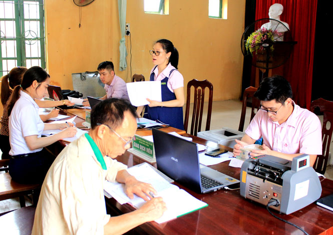 Cán bộ Phòng giao dịch Ngân hàng Chính sách Xã hội huyện Phú Lương thực hiện thủ tục giải ngân nguồn vốn cho vay giải quyết việc làm tại xã Cổ Lũng.