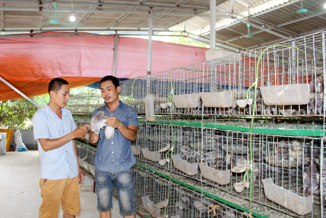 Anh Hoàng Anh Tuấn, Giám đốc HTX Nông nghiệp và Dịch vụ tổng hợp Phú Lương (bên phải) đang chia sẻ kinh nghiệm nuôi chim bồ câu Pháp với thành viên.