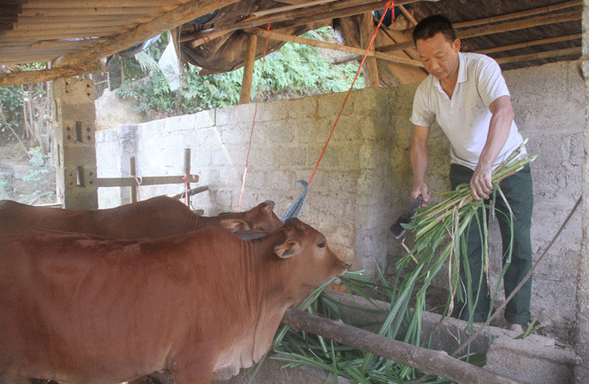 Gia đình anh La Quang Giảng, dân tộc Tày ở xóm Na Dau là một trong 16 hộ nghèo của xã được hỗ trợ bò sinh sản sản năm 2018. Được nhà nước hỗ trợ 13,1 triệu đồng, anh đã đối ứng 4,9 triệu đồng để mua bò. Anh Giảng cho biết: Gia đình có 3 sào ruộng bỏ không do khó khăn về nguồn nước tưới. Từ khi được hỗ trợ kinh phí mua bò giống, tôi đã tận dụng để trồng cỏ voi làm thức ăn cho bò. Từ nuôi bò, tôi tận dụng nguồn phân chuồng để phục vụ trồng trọt. Sau gần 2 năm, gia đình đã có bê bán với giá 15 triệu đồng, hiện nay bò đang chuẩn bị sinh lứa thứ 2.