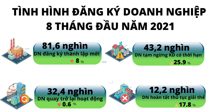 Tính riêng trong tháng 8-2021, cả nước có 5.761 doanh nghiệp thành lập mới với số vốn đăng ký 68 nghìn tỷ đồng và số lao động đăng ký 43,4 nghìn người. Vốn đăng ký bình quân một doanh nghiệp thành lập mới trong tháng đạt 11,8 tỷ đồng. Trong tháng, cả nước có 3.865 doanh nghiệp quay trở lại hoạt động. Số doanh nghiệp rút lui khỏi thị trường là 6.441 doanh nghiệp, trong đó: 3.118 doanh nghiệp đăng ký tạm ngừng kinh doanh có thời hạn, 2.511 doanh nghiệp ngừng hoạt động chờ làm thủ tục giải thể, 812 doanh nghiệp hoàn tất thủ tục giải thể.