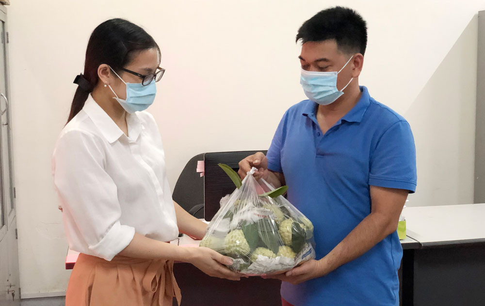 Đoàn viên thanh niên Trung tâm Xúc tiến thương mại (Sở Công Thương) tình nguyện giao na Võ Nhai tới khách hàng ngoài giờ làm việc.