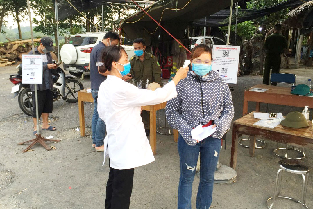 Nhân viên y tế đo thân nhiệt của người dân khi đi qua chốt kiểm soát liên ngành phòng, chống dịch COVID-19 tại xã Yên Lạc (Phú Lương).