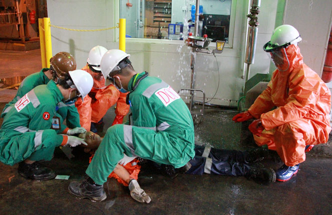 Do không tuân thủ nghiêm ngặt về bảo hộ lao động nên nhân viên đó đã bị phơi nhiễm dung dịch H2S04, cùng với tình huống bất ngờ đã mất bình tĩnh, vấp ngã dẫn đến bất tỉnh. Một nhân viên khác phát hiện ra sự cố nhưng không thể giúp đỡ được nạn nhân liền lập tức kích hoạt tình huống khẩn cấp đến Trung tâm Điều phối tình huống khẩn cấp...