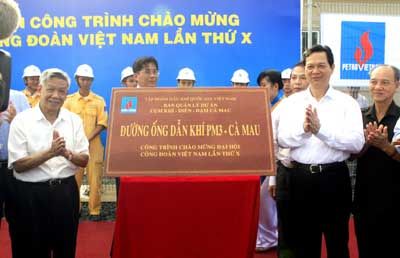 l Trước đó, Thủ tướng Nguyễn Tấn Dũng đã gắn biển công trình đường ống dầu khí PM3-Cà Mau chào mừng Đại hội Công đoàn Việt Nam lần thứ X. Công trình đường ống có chiều dài 325 km vận chuyển khí từ mỏ PM3 với tổng vốn đầu tư gần 300 triệu USD. Tuyến đường ống cung với sản lượng 2 tỷ m3/năm cho Nhà máy điện Cà Mau 1-2 với công suất 1.500 MW và nhà máy đạm sẽ đi vào vận hành vào đầu năm 2012.